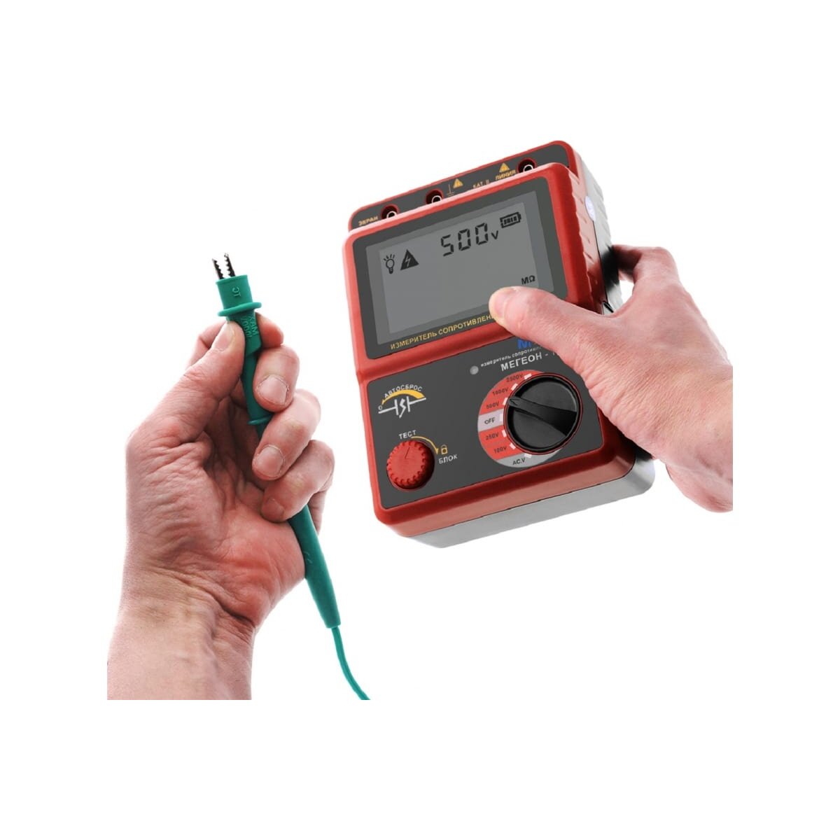 Мегаомметр представляет собой прибор для точного измерения сопротивления изоляции, используя высокое испытательное напряжение (до 2500 В). В случае длительного простоя он автоматически отключается, обеспечивая экономию заряда элементов питания. Модель защищена от перегрузки и надежна в эксплуатации. Частота измерений - 0.5-10 изм/сек.