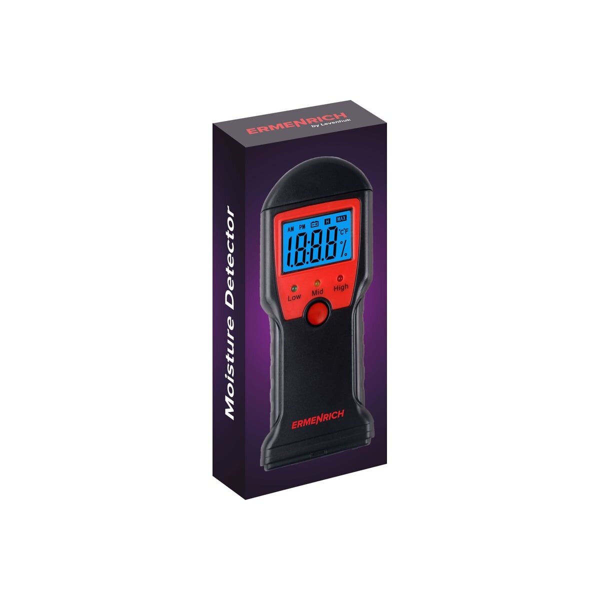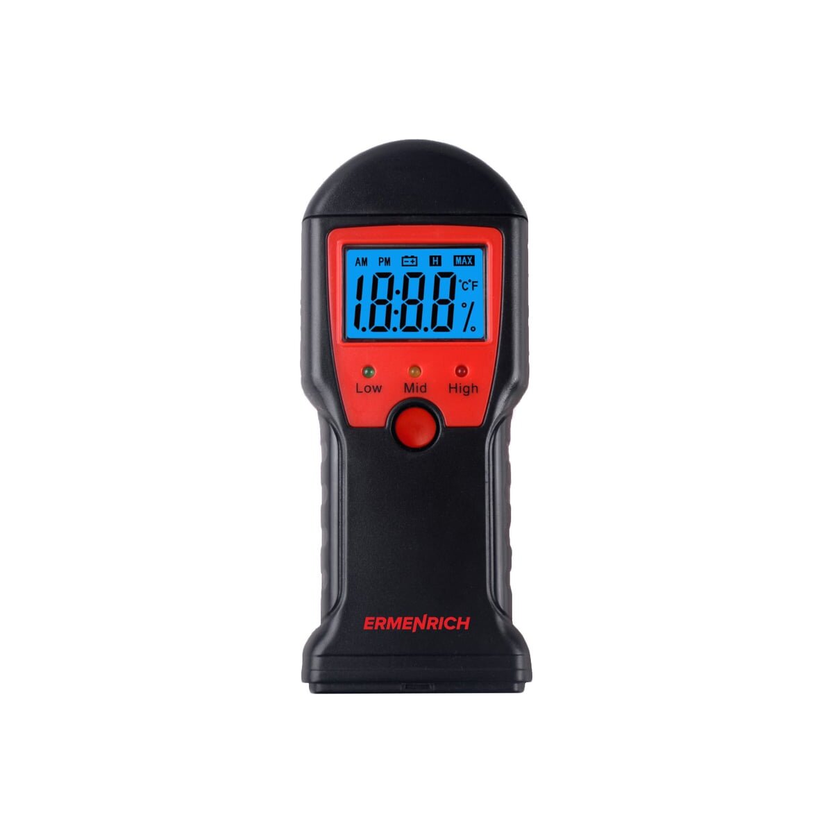 Датчик влажности (влагомер) Ermenrich Wett MW10 – портативный измерительный инструмент, который определяет уровень влажности разных материалов: в первую очередь сделанных из древесины, но также и предназначенных для строительных работ (растворов, смесей и проч.). Он работает по контактной технологии, т. е. имеет пару игольчатых сенсоров, которые и проводят замеры. Также прибор может определять температуру.