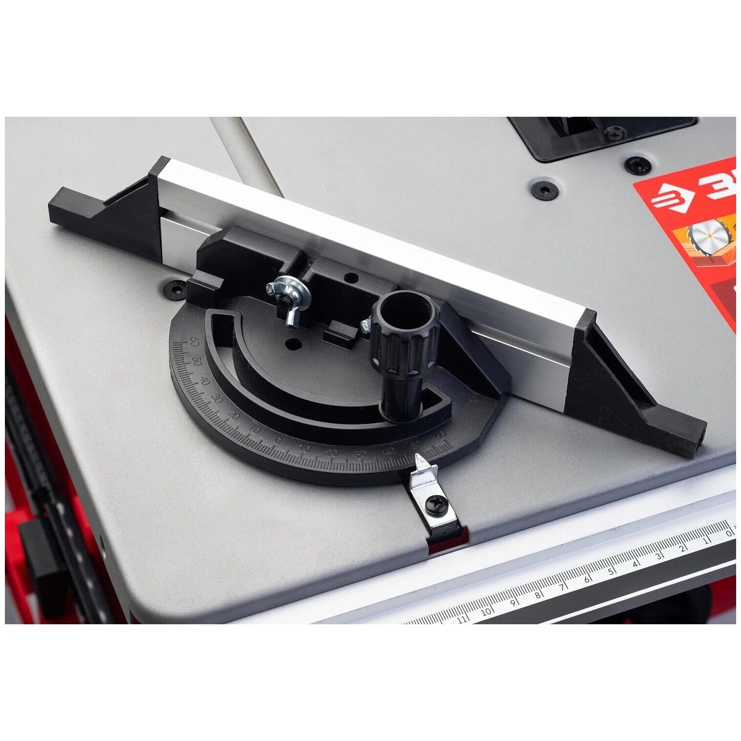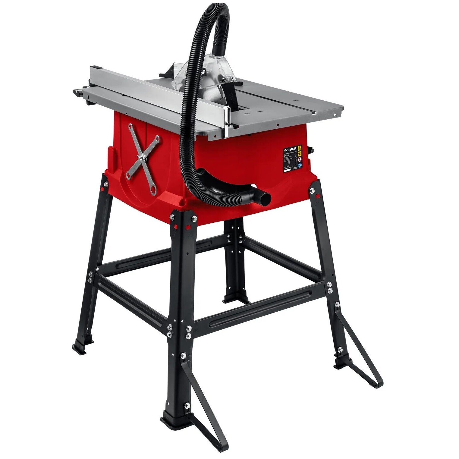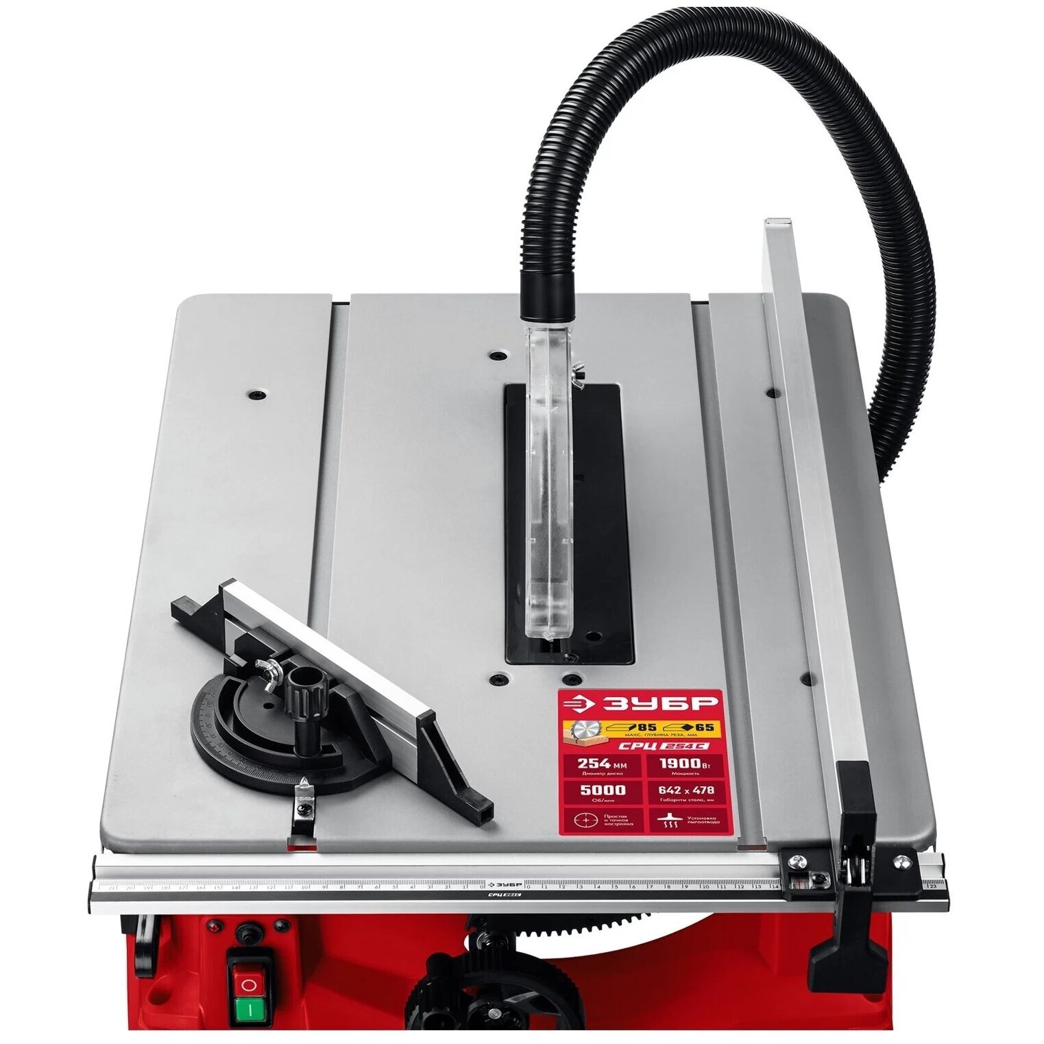 распиловочный станок, кожух защитный, продольная направляющая в сборе, упор угловой, ключ гаечный, толкатель подачи заготовки, пылеотводный шланг, станина с креплением, резиновые опоры
