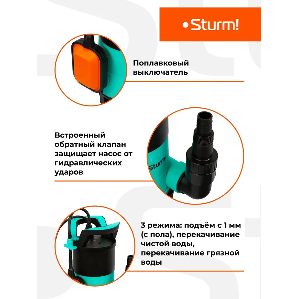 2.В конструкции Sturm WP9745PVU предусмотрен поплавковый выключатель, который включает насос при высоком уровне воды и отключает при низком уровне воды.