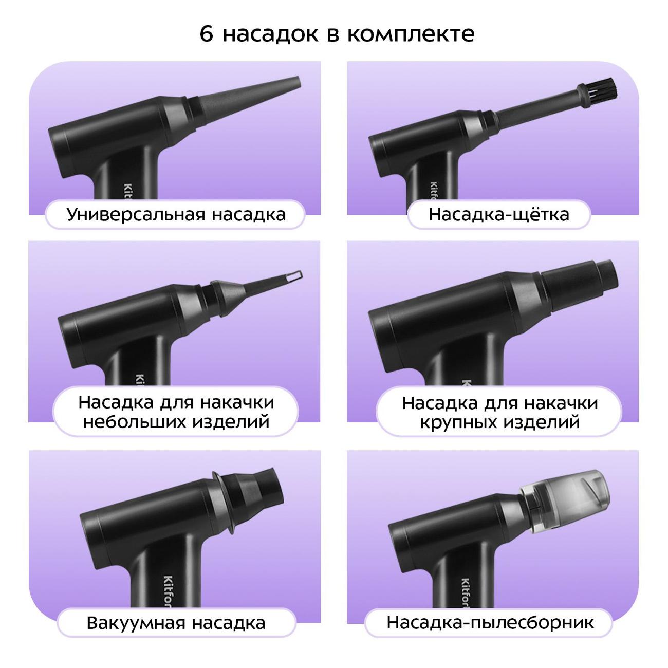 6 насадок в комплекте: универсальная, удлиненная, насадка-щетка, для накачки небольших и крупных надувных изделий, вакуумная насадка.