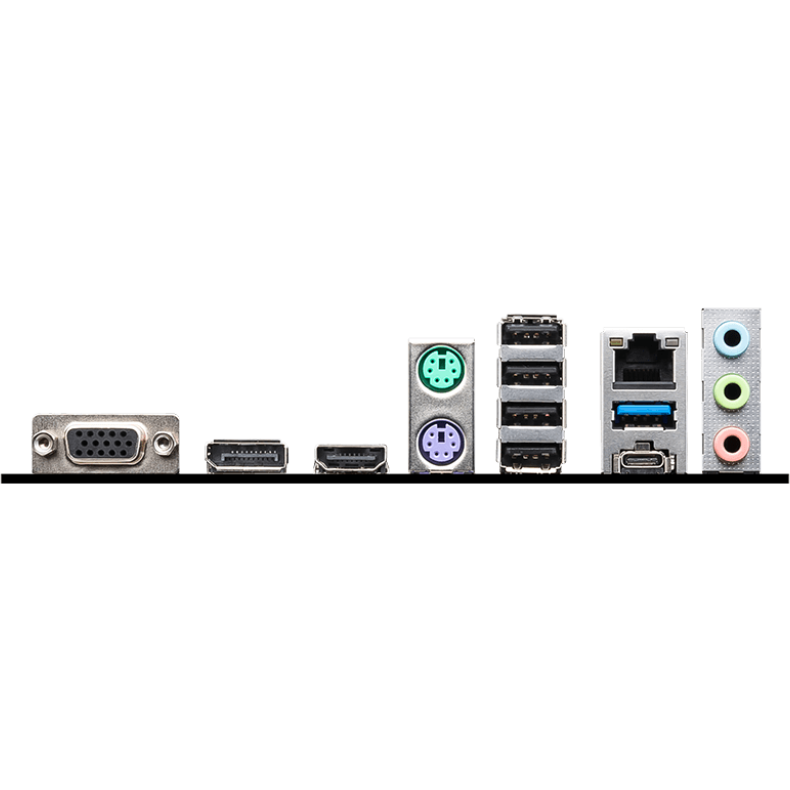2 x PS/2, 4 x USB 2.0, USB 3.2 Gen1, USB 3.2 Gen2 Type-C, VGA, HDMI, DisplayPort, RJ-45