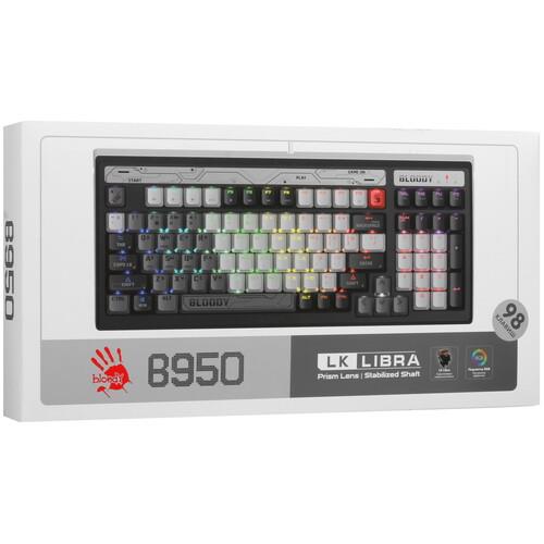 Клавиатура проводная A4Tech Bloody B950 оборудована тактильными переключателями A4Tech LK Libra, которые отличаются тихим нажатием. Кейкапы изготовлены из пластика высокой жесткости, устойчивого к истиранию символов. При синхронизации аксессуара используется 1.8-метровый USB-кабель.