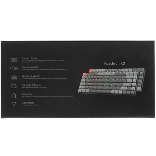 Клавиатура Keychron K3 получает питание от встроенного аккумулятора. Колпачки изготовлены из пластика ABS и поддерживают технологию быстрой замены. В комплекте предусмотрены инструменты для снятия колпачков и извлечения переключателей, а также кабель USB.