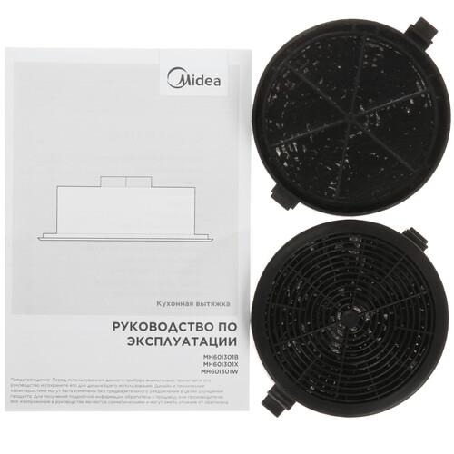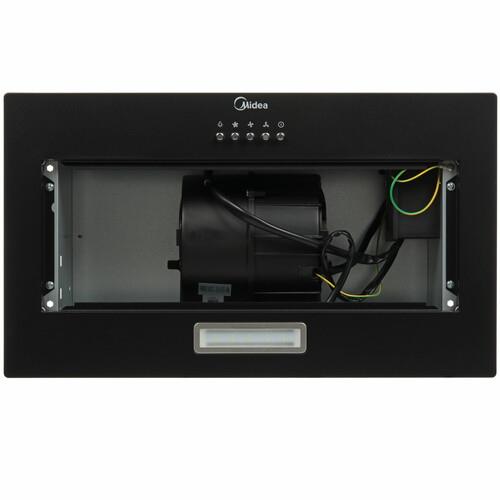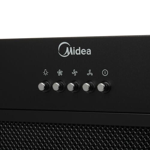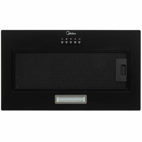 Вытяжка полновстраиваемая Midea MH60I301B в металлическом корпусе черного цвета оборудована фильтром грубой очистки, который поглощает жировые брызги и не допускает оседания на внутренних деталях. Для удаления копоти предусмотрен режим отвода. Очистка воздуха от неприятных запахов производится с помощью функции «Циркуляция».