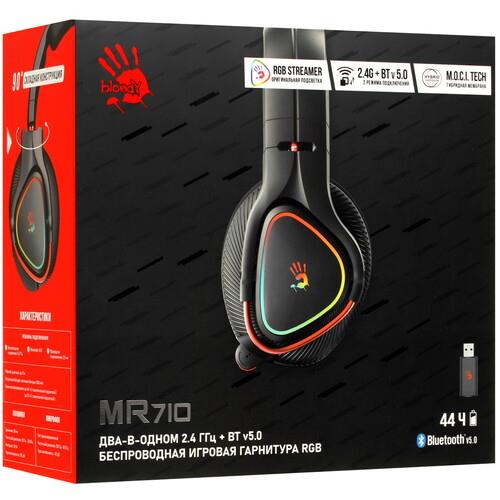 Геймерская стильная Bluetooth-стереогарнитура A4Tech Bloody MR710 с интегрированной RGB-подсветкой имеет выдвижной микрофон для передачи голоса пользователя. Наушники отличаются высокой емкостью встроенного аккумулятора, обеспечивающего до 44 ч работы при полном заряде. Для зарядки АКБ используется разъем USB Type-C.