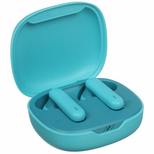 Наушники TWS JBL Wave Flex 2 в синем цвете представлены в виде беспроводных вкладышей с подзарядкой от персонального кейса того же оттенка. В футляре они располагаются горизонтально, а в ушах фиксируются без дополнительного крепления с помощью пластиковых амбушюров.