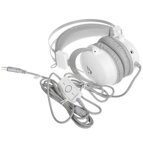Проводные наушники ARDOR GAMING H9 с дизайном в белом и серебристом цветах – игровая модель с поддержкой виртуального объемного звука формата 7.1. Комфортность использования устройства обеспечивают мягкие амбушюры из экокожи и мягкое регулируемое оголовье. Охватывающая конструкция наушников гарантирует изоляцию от внешних шумов. Воспроизведение осуществляется в широком частотном диапазоне – от 20 до 20000 Гц. Качество звучания выражает чувствительность 95 дБ. Динамические излучатели с диаметром 50 мм обеспечивают мощность 10 мВт. Голос передается съемным гибким микрофоном с подвижным креплением, ветрозащитой и всенаправленной диаграммой направленности.