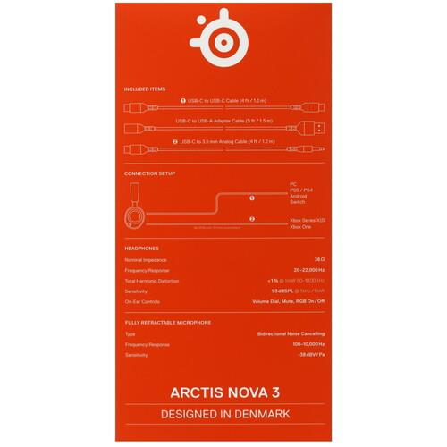 Гарнитура SteelSeries Arctis Nova 3 оснащена сдвоенным оголовьем и мягкими охватывающими амбушюрами, что делает ее эргономичной. На чашах расположены элементы управления для включения/выключения микрофона и подсветки. Разъемы подключения USB, USB Type-C и jack 3.5 мм гарантируют широкую совместимость с игровыми консолями, ПК и мобильными устройствами.