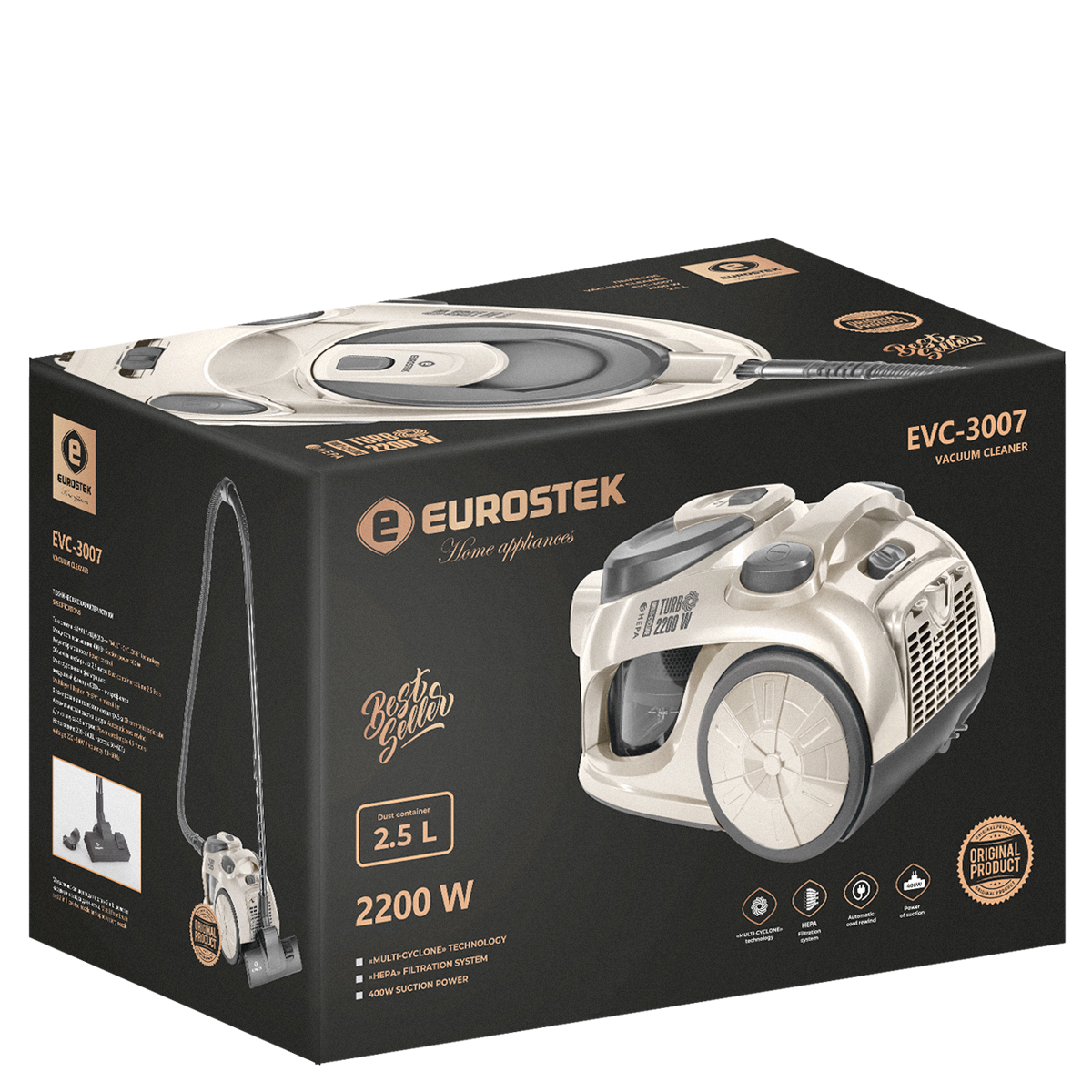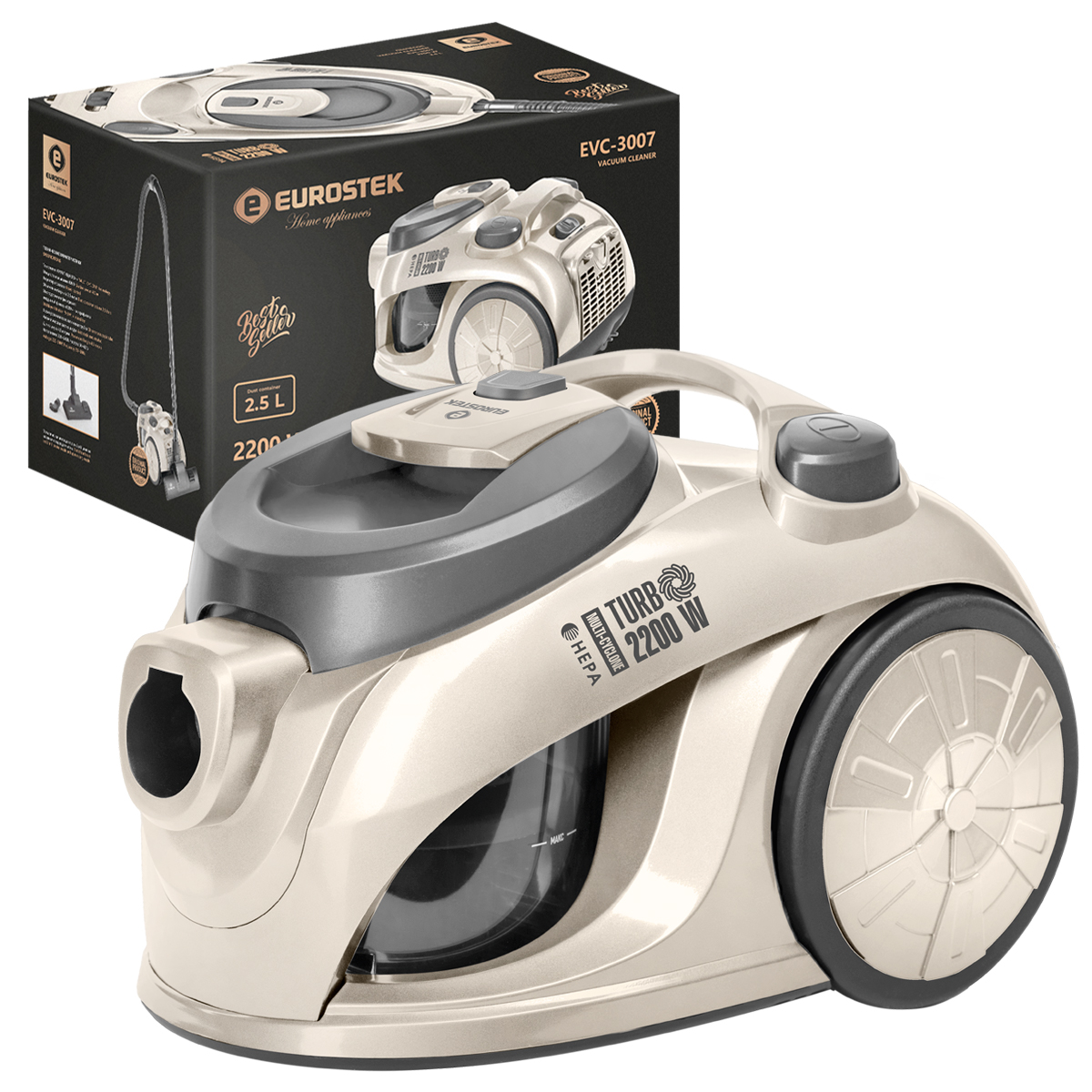 Пылесос без мешка МУЛЬТИ-Циклон Eurostek EVC-3007 с HEPA фильтром. Максимальная мощность 2200 Вт., мощность всасывания 400 Вт., технология МУЛЬТИ-ЦИКЛОН, телескопическая металлическая трубка и щетка для пола, объем пылесборника 2,5 литра, защита от перегрева, автоматическая смотка шнура (Размеры в мм:440х290х290)