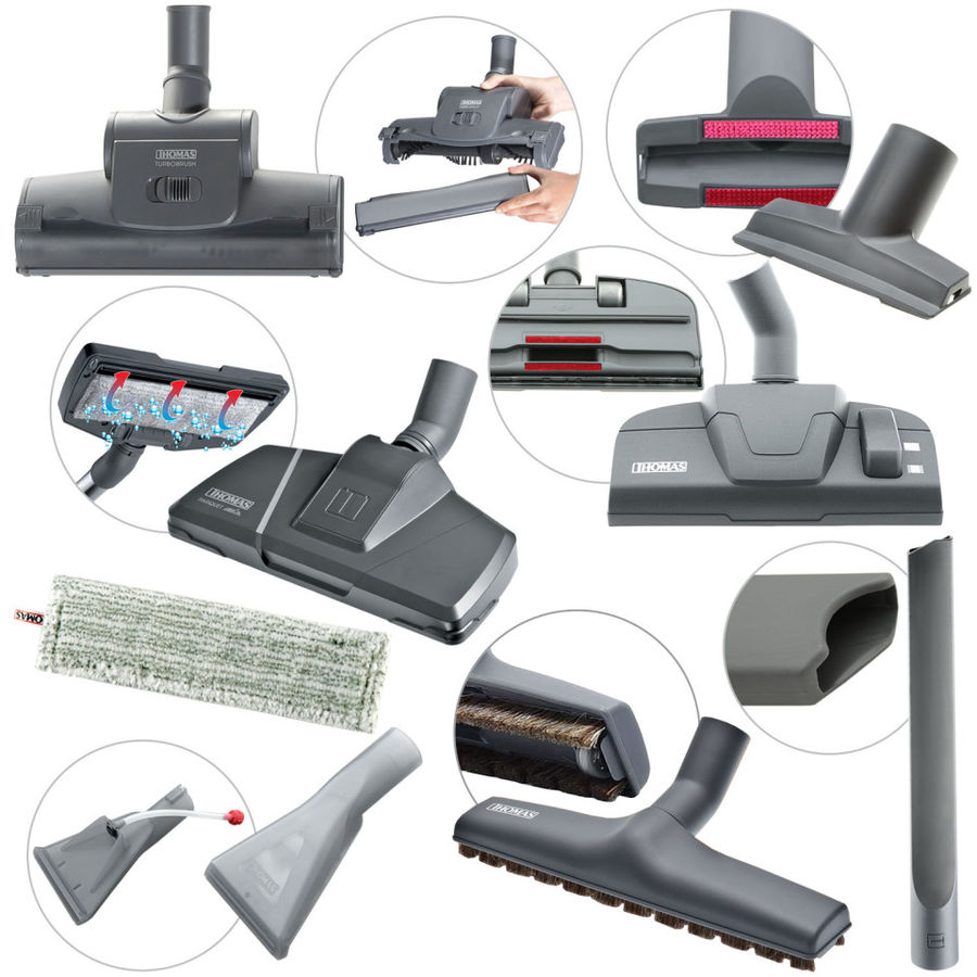 Насадки в комплектенасадка пол/ковер, насадка для мягкой мебели, насадка для сухой уборки паркета, турбощетка, щелевая насадка, насадка для влажной уборки паркета и ламината, распылительная насадка для мягкой мебели