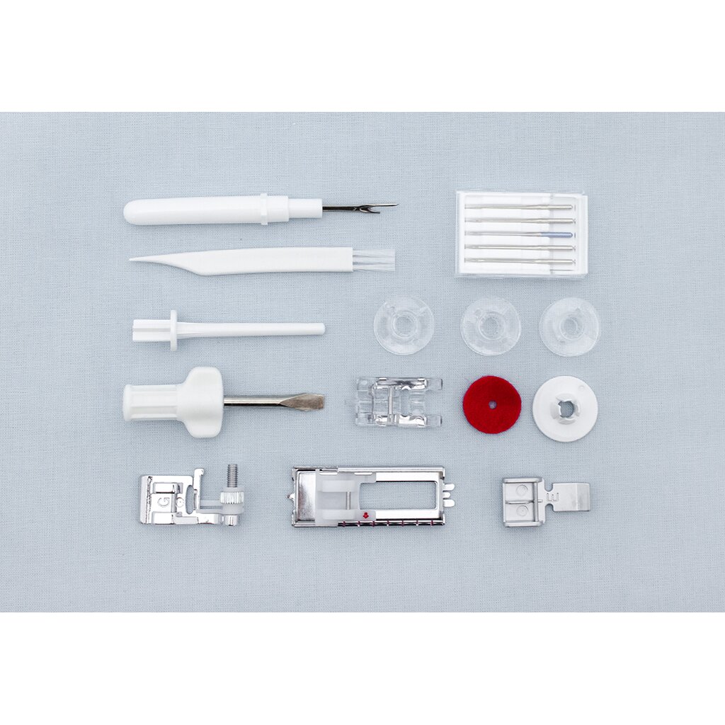Сантиметровая и дюймовая линейка на корпусе машины позволяет производить измерения не отрываясь от работы, а удобная разметка на игольной пластине поможет точному позиционированию ткани под лапкой и выполнению швов на необходимом расстоянии.