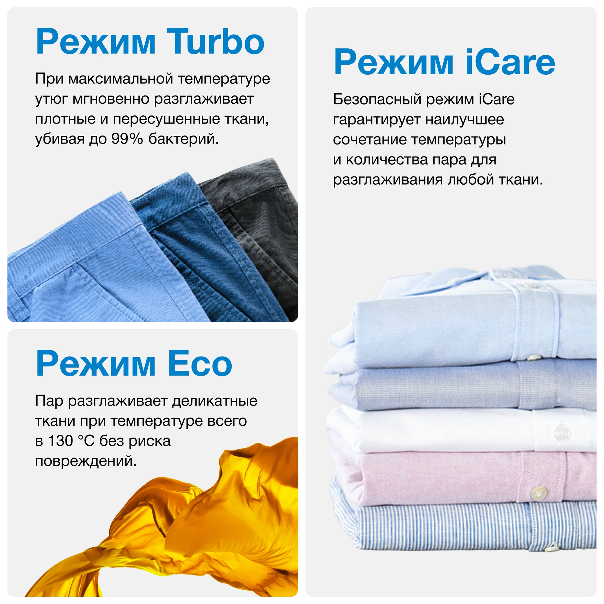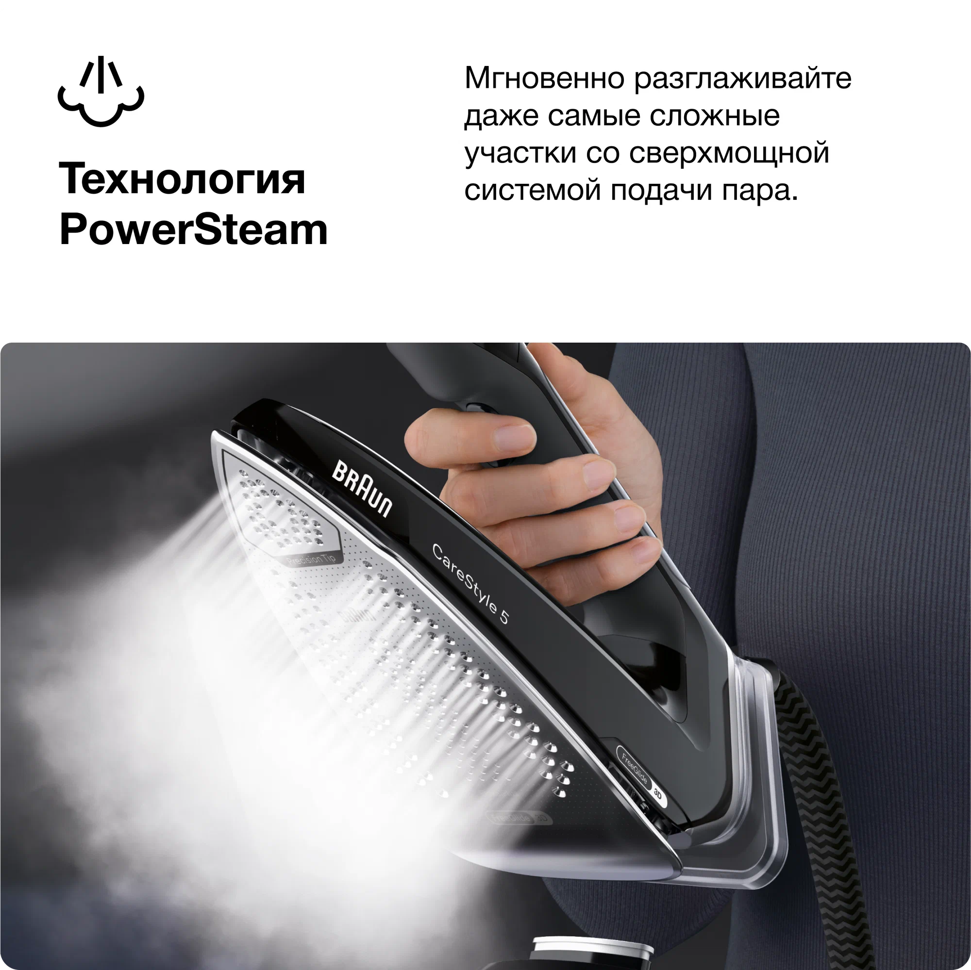 Этот эргономичный утюг может похвастаться уникальной открытой с обратной стороны и мягкой текстурированной ручкой, поэтому вы будете наслаждаться свободой движений во время длительных сеансов глажки. Режим Smart iCare защищает вашу одежду при безопасной температуре для всех видов тканей, которые можно гладить, — для интеллектуальной защиты текстиля.