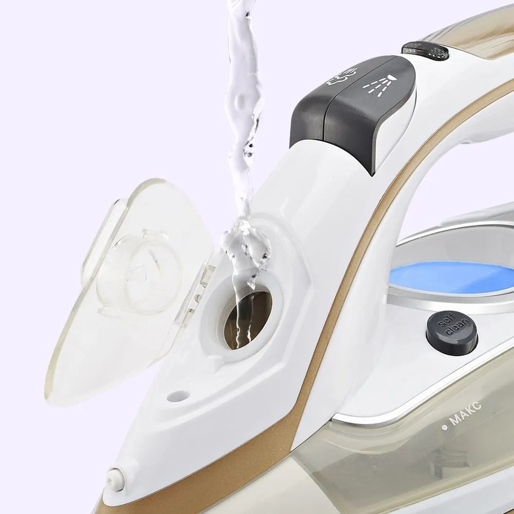 Управление утюгом интуитивное: две кнопки «Больше» и «Меньше» для включения, регулировки уровня нагрева и отключения. Отдельные кнопки «Пар» и «Паровой удар» отвечают за постоянную подачу пара и функцию усиленного удара