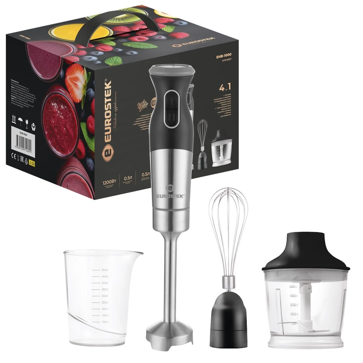 Блендер погружной EHB-1000. Мощность 1200 Вт, низкий уровень шума, 2 скорости, стальной нож, мерный стакан - 500мл, стальной венчик, измельчитель - 500мл