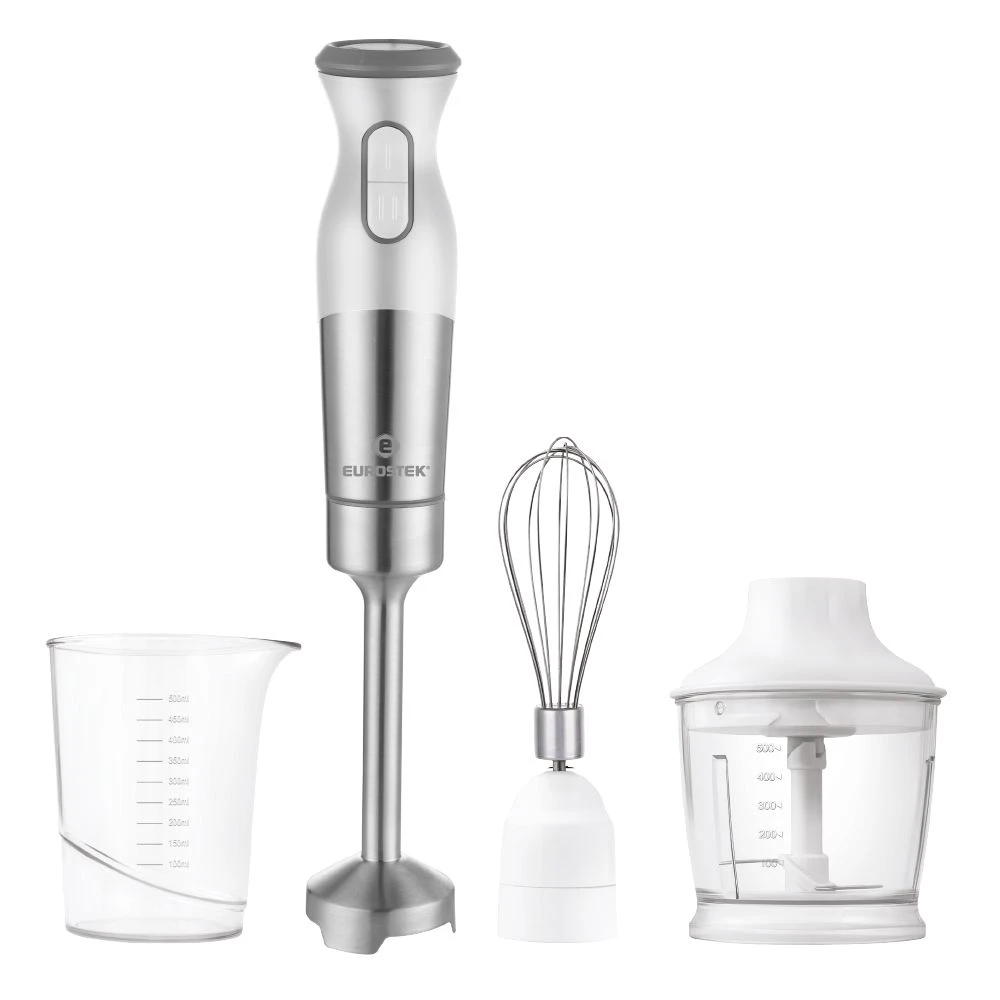 Мощность 1200 Вт, низкий уровень шума, 2 скорости, стальной нож, мерный стакан - 500мл, стальной венчик, измельчитель - 500мл