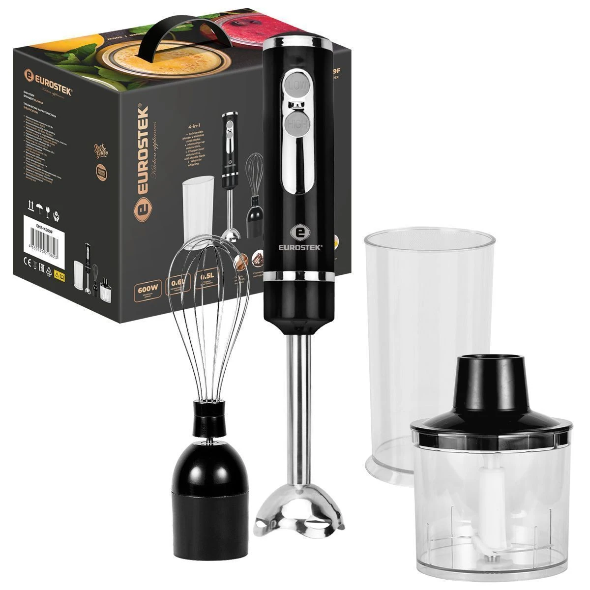 Блендер погружной EHB-KS09F. Мощность 600 Вт, низкий уровень шума, 2 скорости, стальной нож, мерный стакан - 600мл, стальной венчик, измельчитель - 500мл