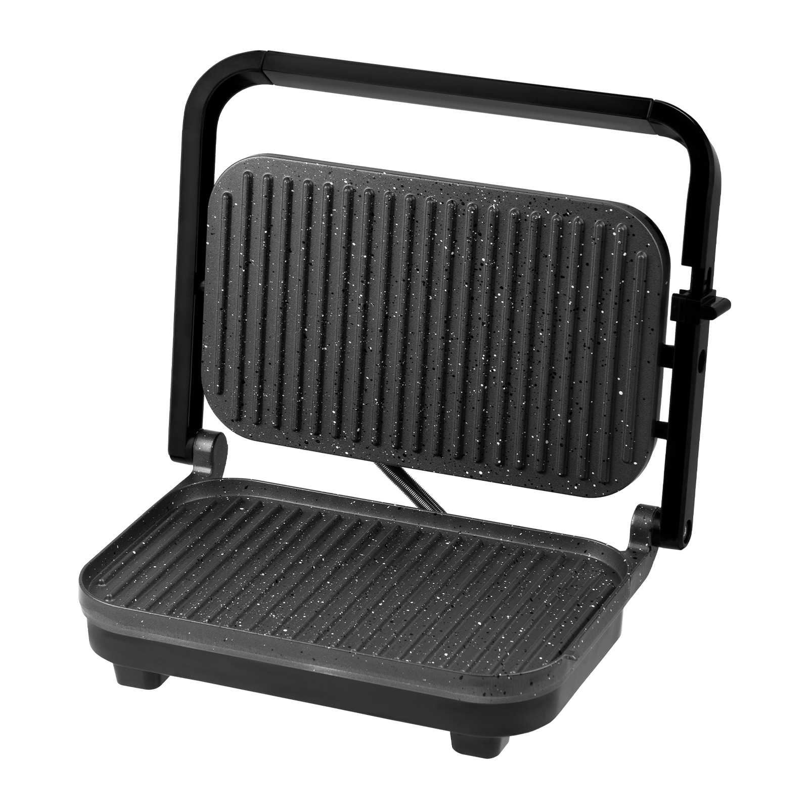 Подвижная верхняя нагревательная панель подстраивается под высоту продуктов и позволяет готовить бутерброды или мясо любой толщины.