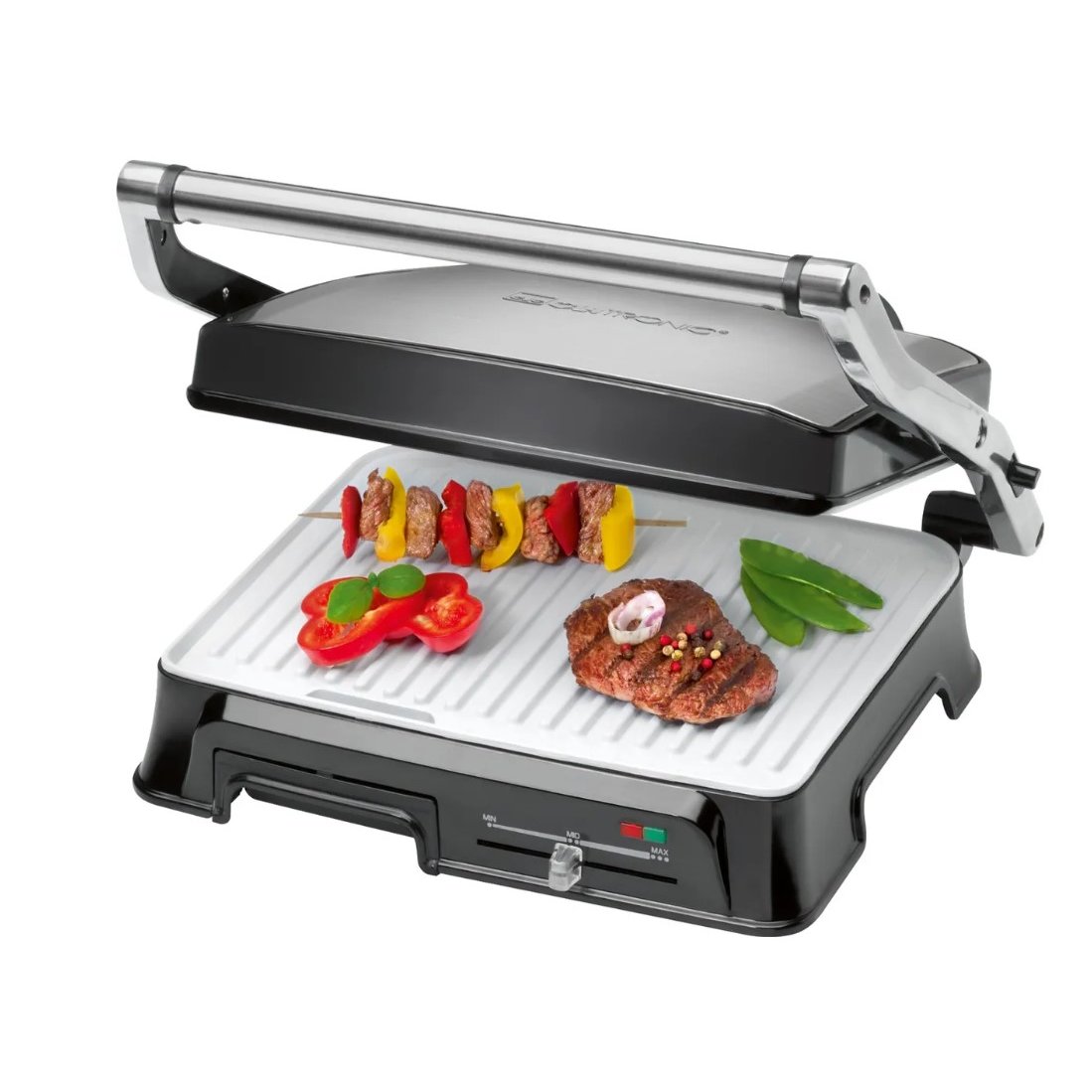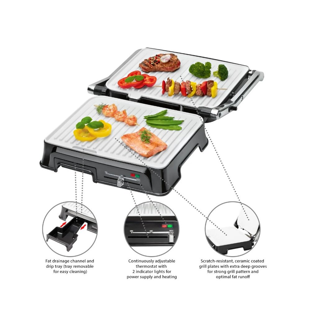 Гриль Clatronic KG 3571 Keramik - один из лучших образцов гриля для дома. Все, что вы приготовите на нем, будет иметь золотистый цвет, хрустящую корочку, аппетитные полоски от ребристых жарочных пластин и характерный запах, которого не добьешься обычным приготовлением на сковородке. Но кроме мяса на нем можно жарить рыбу, запекать овощи, делать омлеты и горячие бутерброды. Плавно регулируемый термостат, короткое время приготовления, устойчивые к царапинам, керамические пластины для гриля с очень глубокими канавками для интенсивного гриля и оптимального отвода жира, большая теплоизолированная ручка.