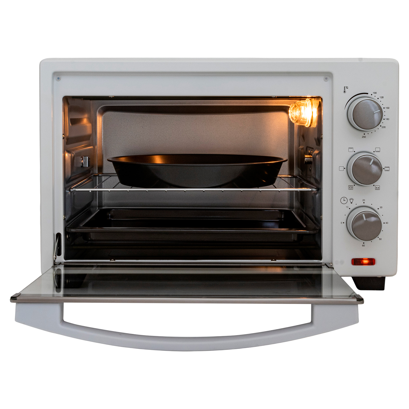 электропечь, металлическая решетка, плоский противень, круглая форма для пиццы, ухват для противня, вертел, ухват для вертела, инструкция на русском языке