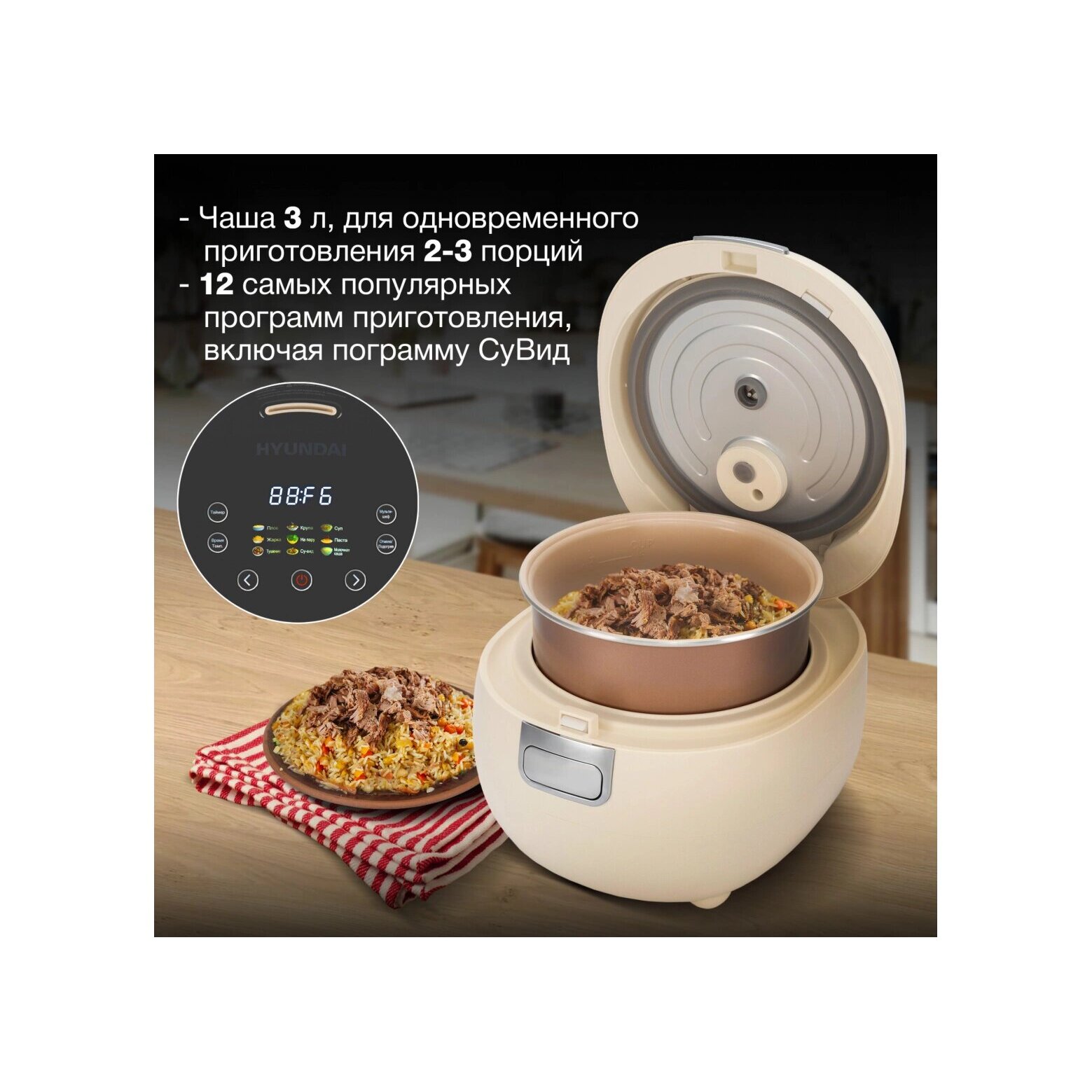 9 самых популярных авто программ приготовления, а так же функция подогрева и автоматического поддержания температуры после готовки., программа Мультишеф для полностью ручной настройки времени и температуры готовки