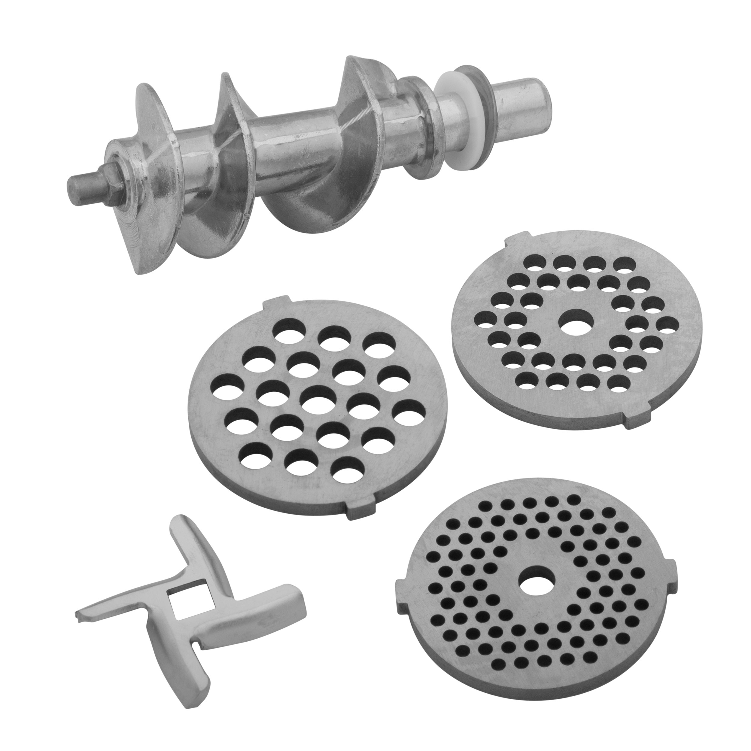В комплект входят 3 решетки для изготовления фарша, а также специальные насадки для колбас и кеббе.