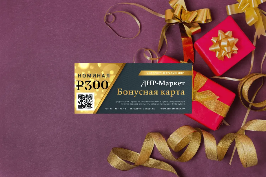 Бонусная программа от "DNR-Market", это уникальная возможность накапливать бонусные деньги и оплачивать ими последующие покупки. Бонусный счет дает Вам право оплаты товаров. 1 бонус - эквивалентен 1 рублю. За любую покупку от 5000 рублей в магазине "DNR-Market" Вы получаете 300 бонусных рублей. За любую покупку от 10 000 рублей в магазине "DNR-Market", Вы получаете 2000 бонусных рублей.