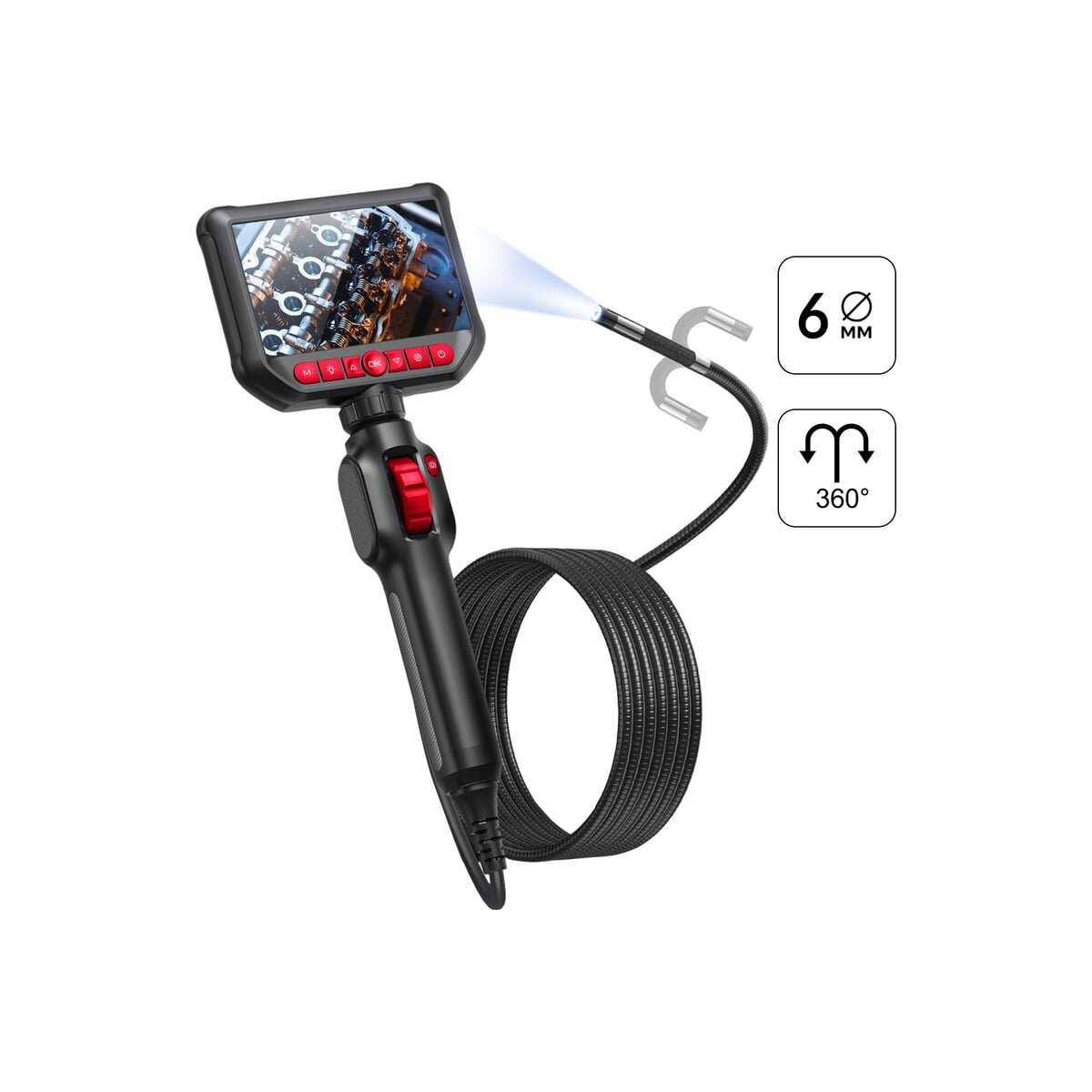 iCartool IC-VC156 управляемый видеоэндоскоп с поворотной камерой на 360° и экраном диагональю 4,3”. Экран с IPS-матрицей имеет простой и удобный интерфейс. Камера разрешением 2 Мп обеспечивает качественную картинку, а пошаговый цифровой зум помогает рассмотреть мелкие детали.