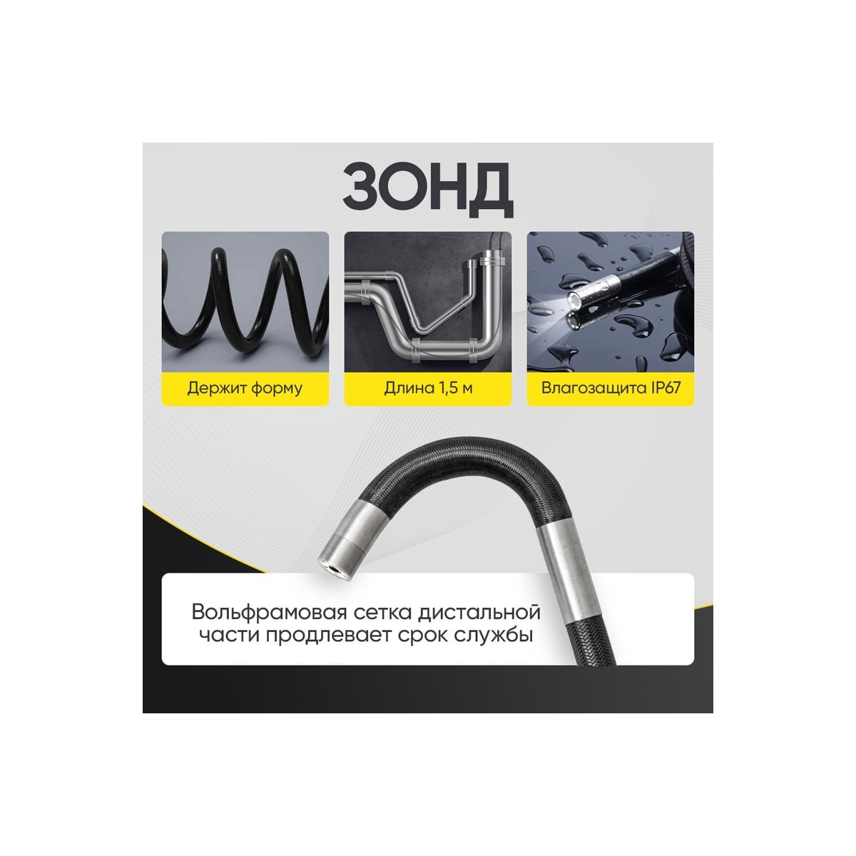 Зонд эндоскопа имеет универсальную длину 1,5 м и диаметр камеры в 6 мм, оптимальный для автодиагностики. Зонд полужесткий, запоминает форму изгиба, которую ему придают. Внешняя оболочка дистальной части усилена вольфрамом для увеличения срока эксплуатации.