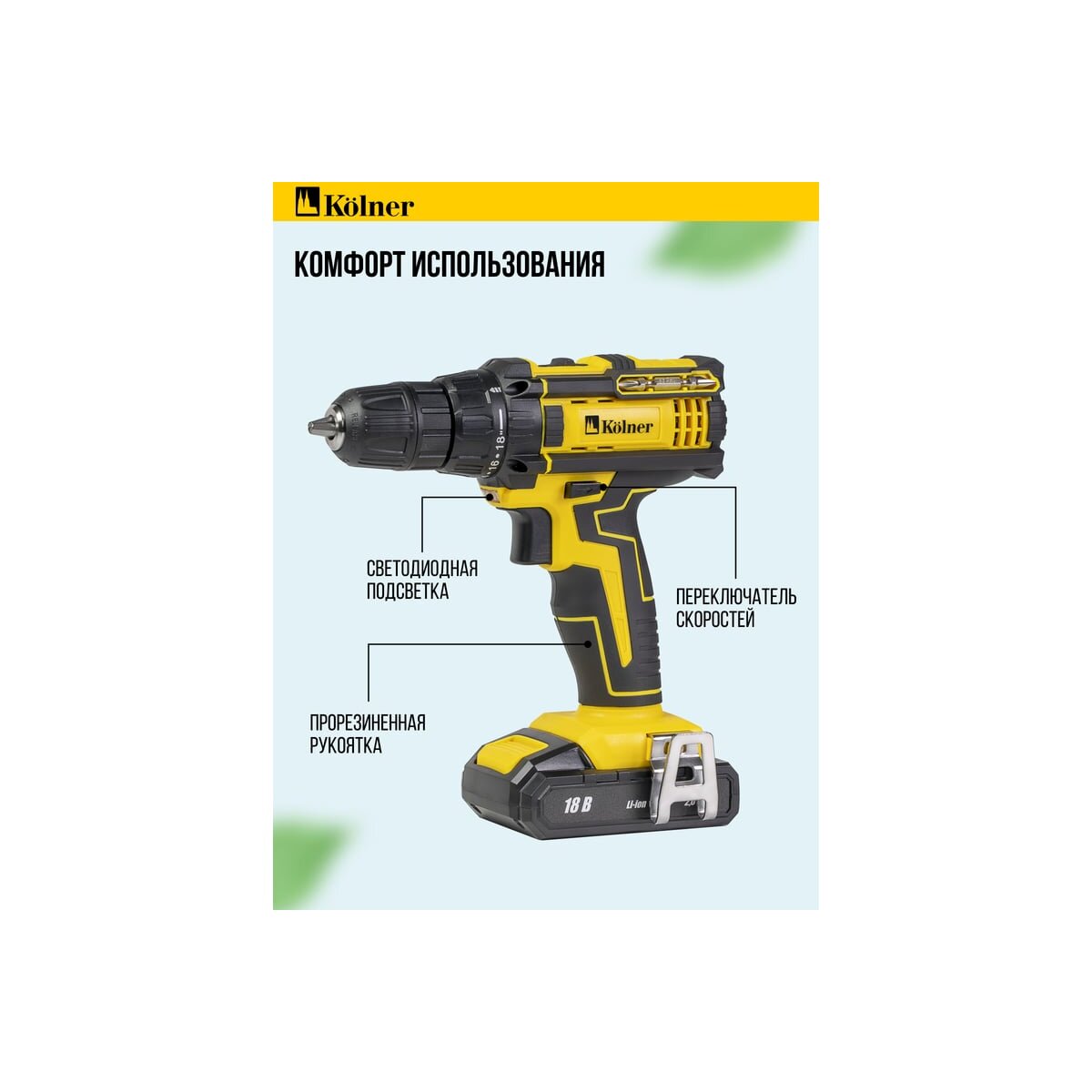 Дрель-шуруповёрт Kolner KDD 18BL — ваш надежный помощник в любых ремонтных и строительных задачах, обеспечивающий мощность и удобство в каждом движении.