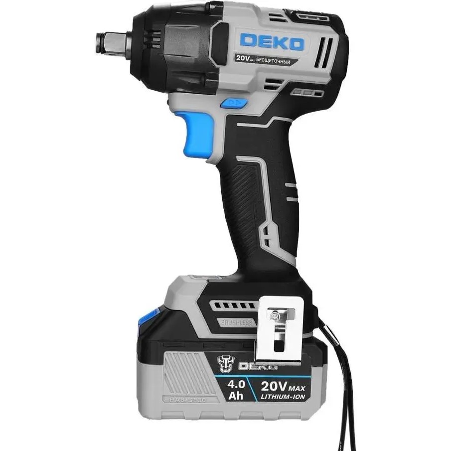Гайковерт, 2 шт. АКБ, зарядное устройство, скоба поясная, саморез, уплотнительное кольцо, штифт, руководство по эксплуатации, кейс.