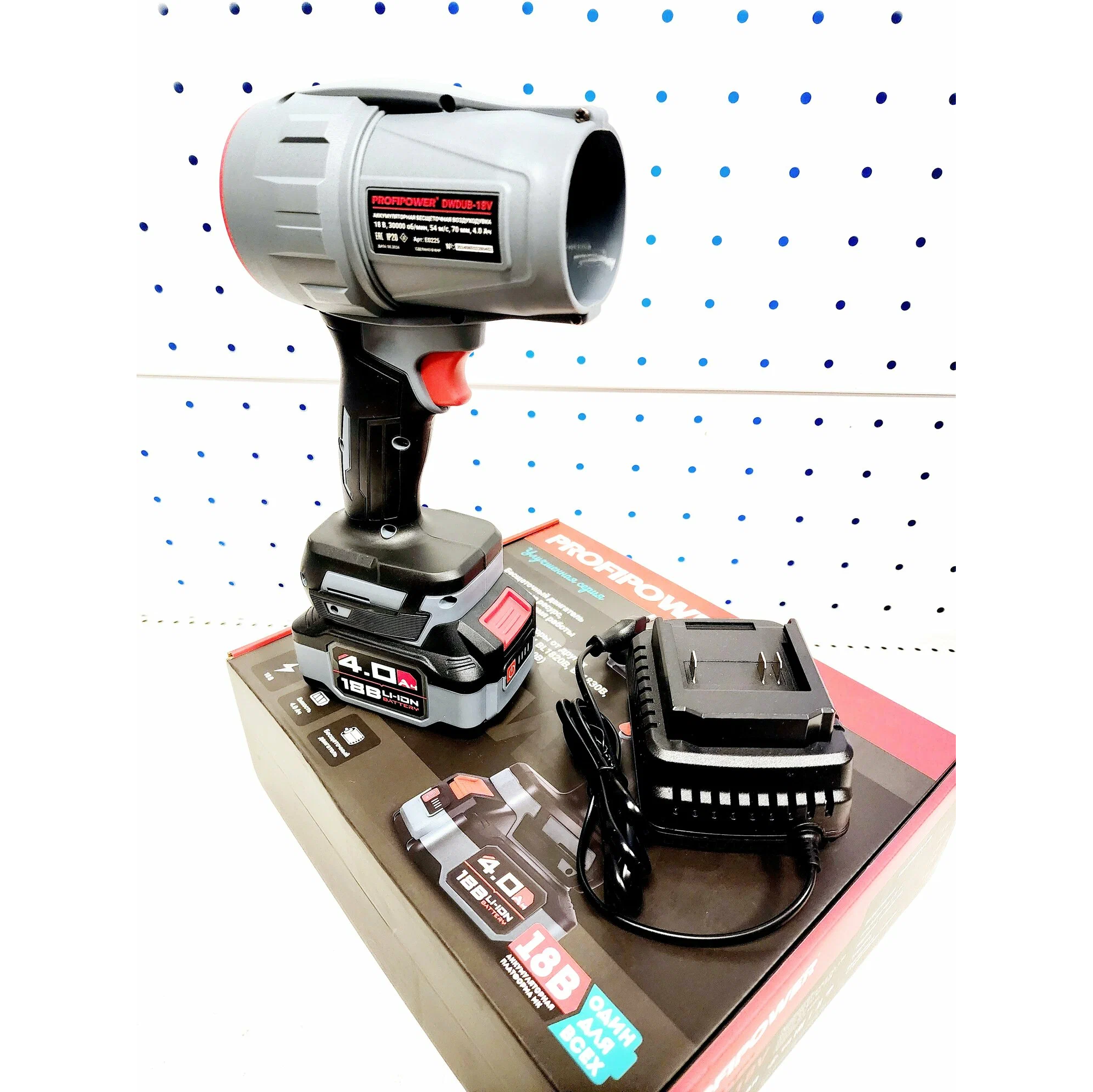 Основные характеристикиБрендPROFIPOWERТипвоздуходувкаТип двигателяаккумуляторныйМаксимальная скорость воздуха54 м/сОсобенностиобдувТип аккумулятораLi-ionЕмкость аккумулятора4 А·чНапряжение аккумулятора18 ВВремя работы от аккумулятора60 мин.Зарядное устройствона 1 аккумуляторКоличество аккумуляторов в комплекте1Способ транспортировкиручнойВес1.8 кгПодробная комплектацияАккумуляторная воздуходувка; аккумулятор 1шт; зарядное устройство; коробка; тех.паспорт
