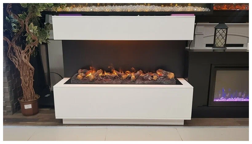 Сверхширокий линейный очаг с технологией пламени 3D. Эффект пламени достигается с помощью парогенератора и галогеновых ламп, что обеспечивает ощущение огня, не отличимого от настоящего.