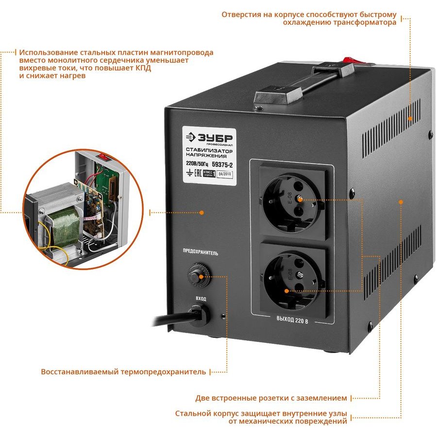 Особенности: Стабилизатор напряжения ЗУБР предназначен для точного и быстрого выравнивания сетевого напряжения для защиты бытовой техники и оборудования. Устройство обеспечивает эффективную защиту электроприборов от нестабильного по значению напряжения в сети. Релейный тип стабилизации.