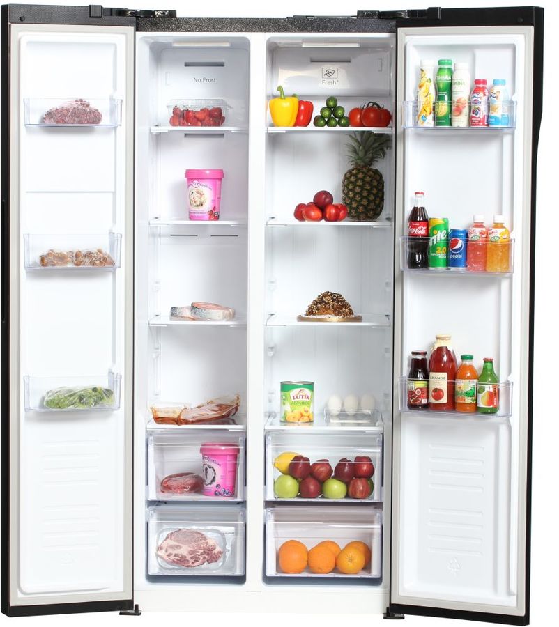 количество камер: двухкамерный; расположение морозильной камеры- сбоку (Side by Side), размораживание морозильной камеры- No Frost, защита от детей, цвет: нержавеющая сталь