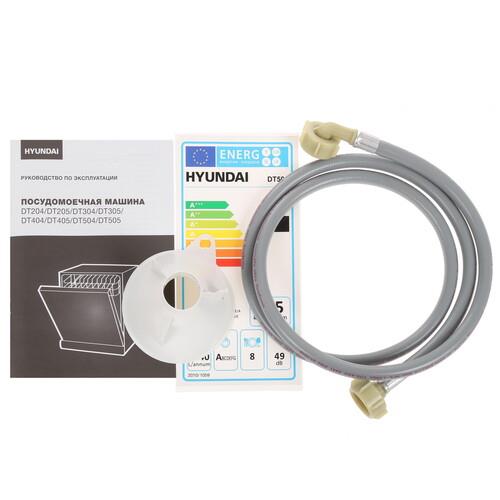 Посудомоечная машина Hyundai DT505 оптимальна для небольшой семьи. Модель характеризуется долгим сроком эксплуатации и простотой использования. Модель рассчитана на загрузку 8 комплектов посуды. Для тарелок, кружек и столовых приборов предусмотрены отдельные выдвигающиеся корзины. Пользователь может задать необходимое время работы с помощью функции отсрочки запуска.