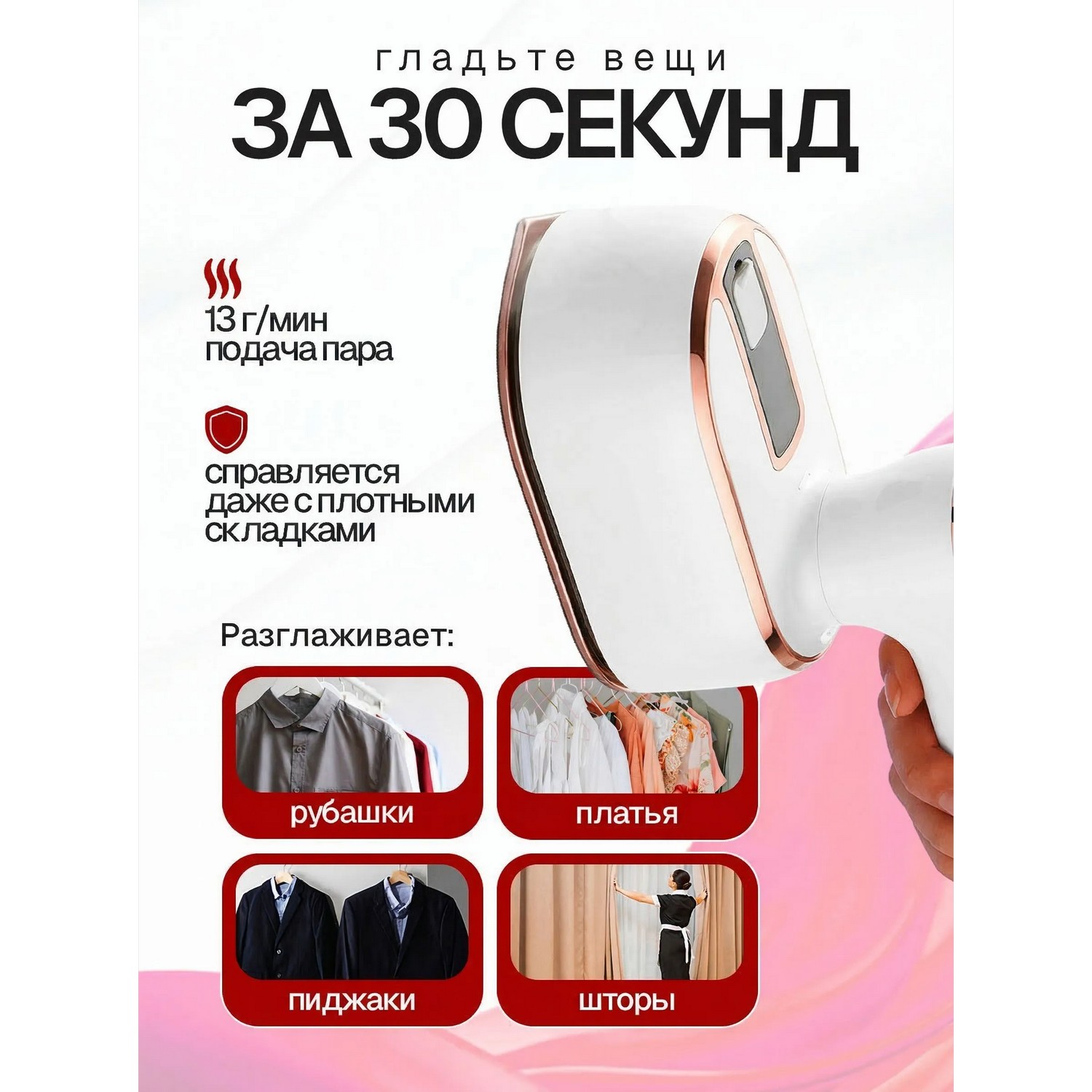 Особенности утюга, отпаривателя: Вертикальное отпаривание, Горизонтальное отпаривание, Дозалив воды, Ручной