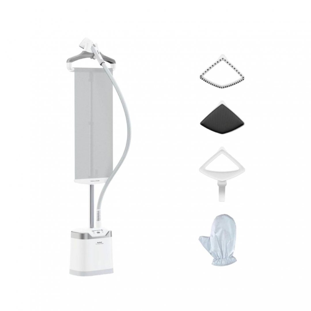 Вертикальный отпариватель Tefal IT8470E1 оснащен вертикальной гладильной доской. Это создает дополнительный упор во время обработки вещей и улучшает результат. Для фиксации одежды в устройстве предусмотрена вешалка. Использование термостойкой рукавицы помогает избежать ожога. Высота телескопической стойки регулируется с учетом предпочтений. Подошва утюга изготовлена из нержавеющей стали. Встроенные индикаторы оповещают об активации, готовности к работе и наличии воды.