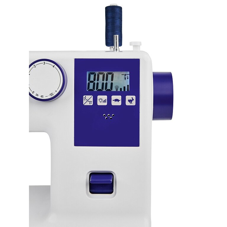 Бытовая электронная швейная машина JAGUAR Jeans Indigo со встроенным сервоприводом, вертикальным классическим челноком и ЖК дисплеем, отображающим установленные параметры функций.