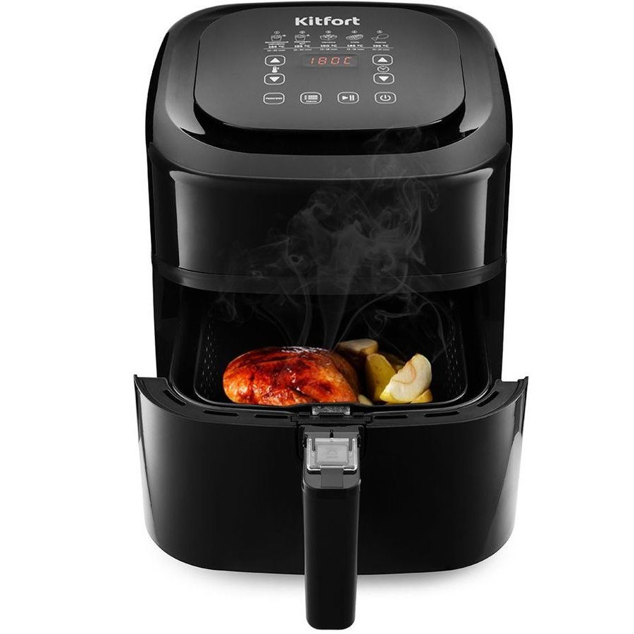 Описание: Аэрогриль, аэрофритюрница и духовка. Позволяет готовить большинство продуктов с минимальным количеством масла или вовсе без его добавления. Благодаря циркуляции горячего воздуха, продукты обжариваются со всех сторон, получаясь при этом нежными внутри и с хрустящей корочкой снаружи. Аэрогриль оснащён электронным управлением, он имеет 5 автоматических программ. Каждая программа имеет свою температуру приготовления, время готовки задаётся автоматически, исходя из веса продуктов. В инструкции представлены рецепты разнообразных блюд. Съёмный поддон и корзина имеют антипригарное покрытие, благодаря чему они легко чистятся после использования, а блюда можно готовить практически без добавления масла.