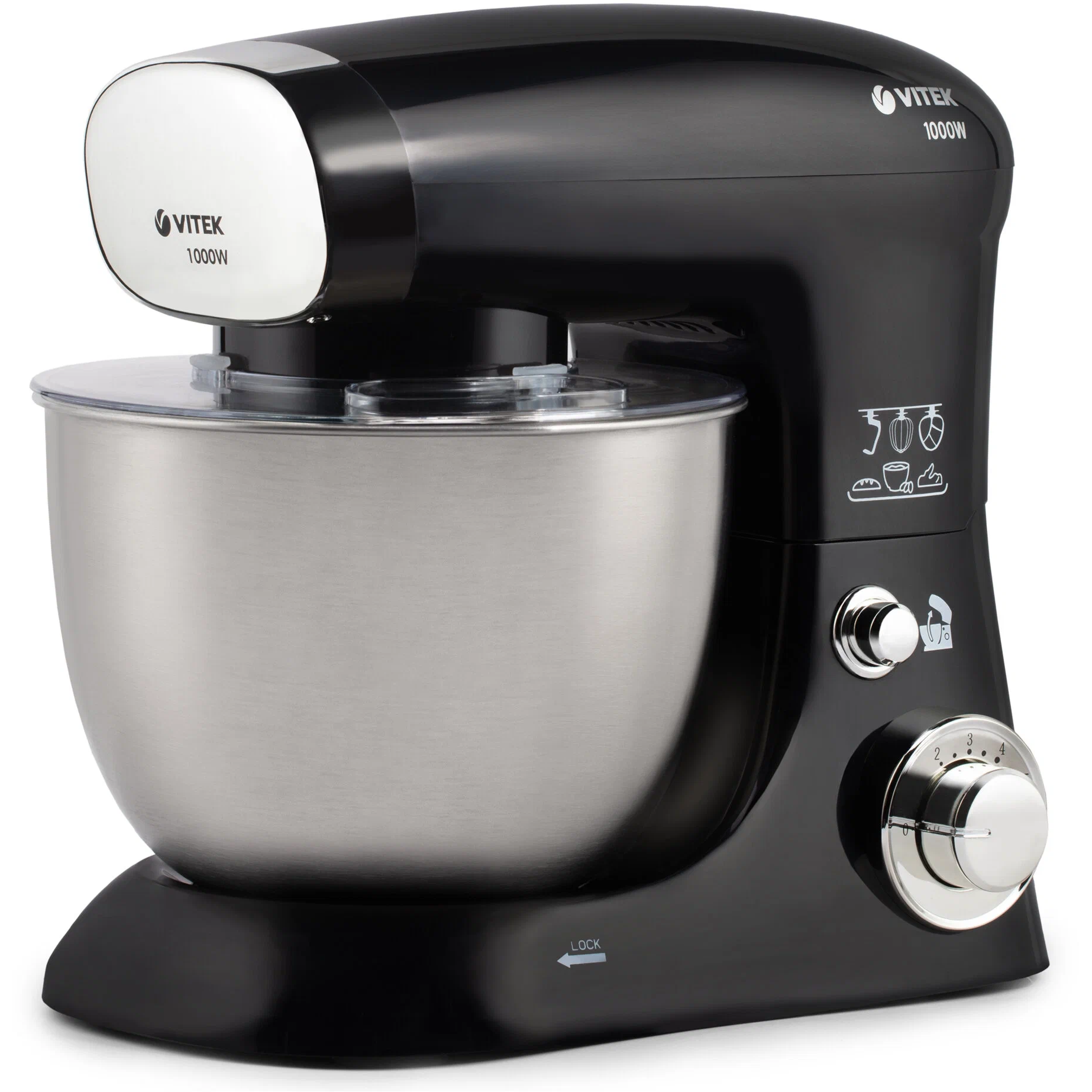 Основные характеристикиБрендVITEKЦвет товарачерныйТиппланетарный стационарныйОсобенности конструкциизащитная крышка на чашу, прорезиненная ручкаМощность1000 ВтЧисло скоростей6Количество насадок3Материал корпусапластикМатериал чашинержавеющая стальОбъем чаши4 лНасадкивенчик для взбивания, насадка для приготовления пюреДлина сетевого шнура1.2 мВес3.9 кгДополнительная информациялопатка в комплекте; насадка для смешивания