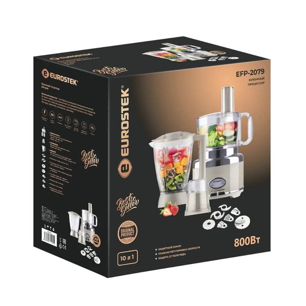 Кухонный комбайн "Eurostek" EFP-2079. Максимальная мощность 800Вт; металлический корпус, плавная регулировка скорости; измельчитель 1.2л., блендер 1.75л., кофемолка. Стальные лезвия измельчителя; диски для размягчения, получения эмульсий. Нарезка тонкими ломтиками, шинковка, приготовление жульена, картофельная терка - с 4-мя вставками.