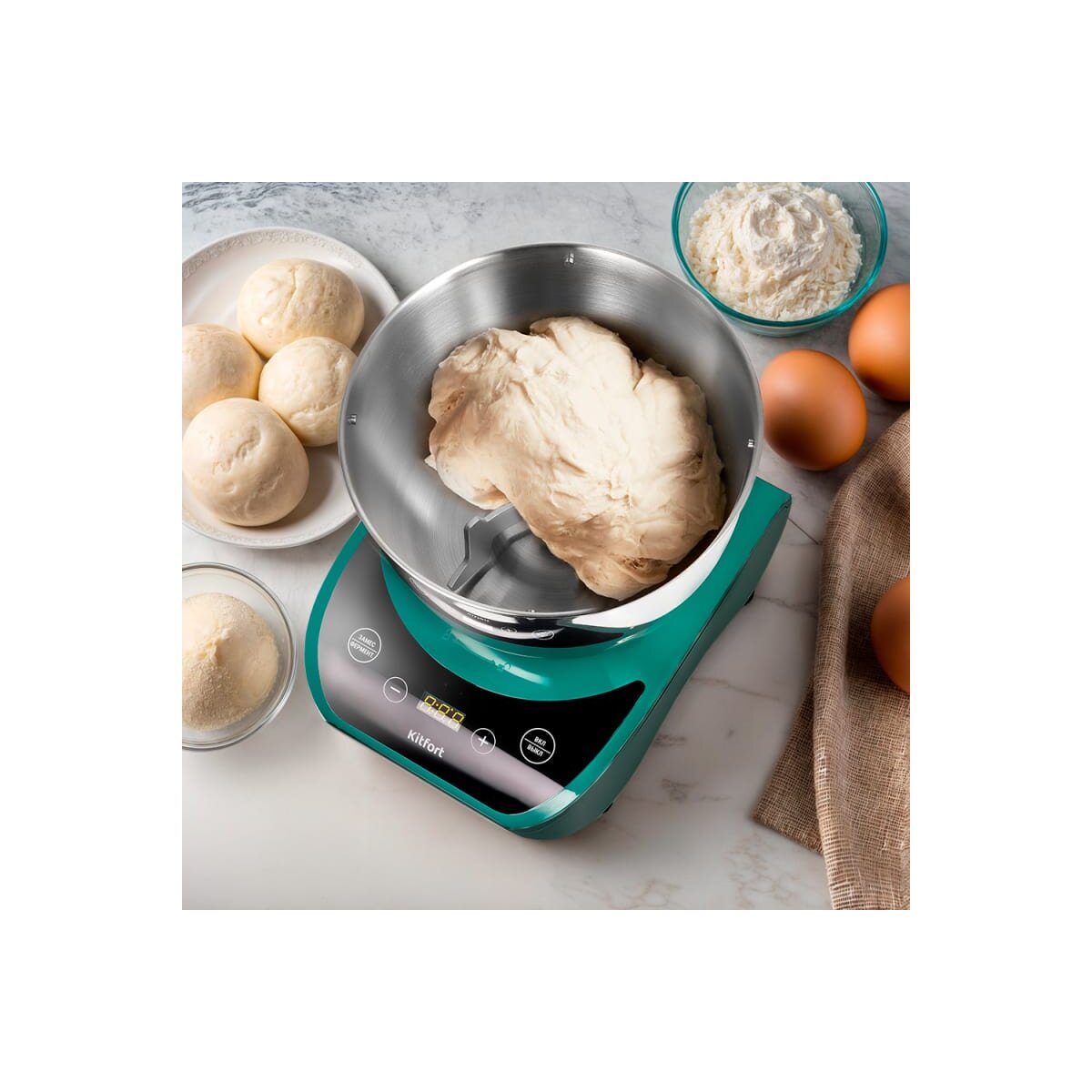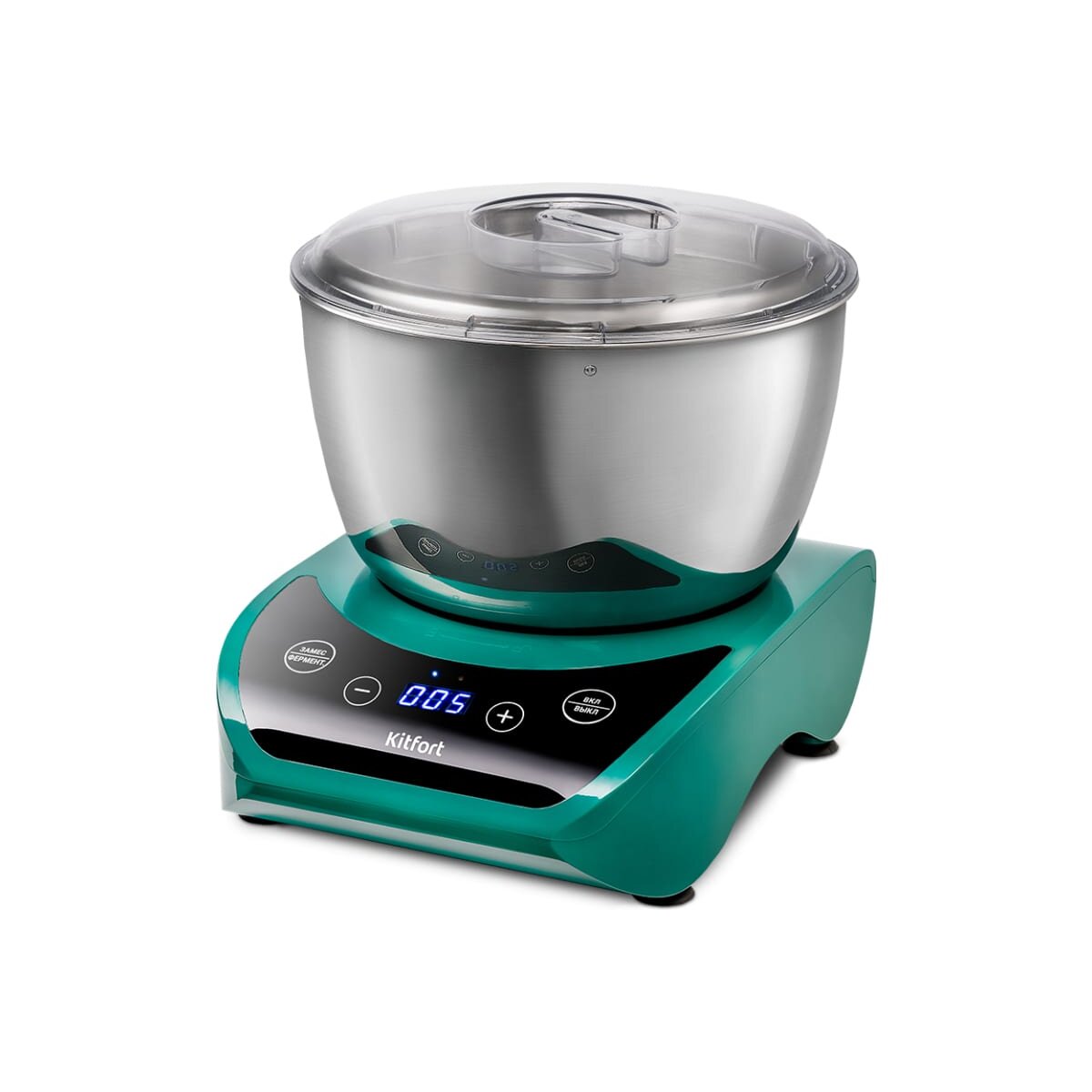 Управление прибором осуществляется с помощью сенсорных кнопок на панели управления. Также есть дисплей, на котором отображается время работы прибора. Тестомесильная машина может работать в автоматическом режиме. Вам достаточно только положить ингредиенты, надеть насадку и установить время замеса: от 5 до 15 минут с шагом 2 минуты. После того как прибор замесит тесто, его можно оставить на расстойку прямо в чаше и выбрать время от 10 минут до 1 часа 45 минут с шагом 10 минут. Чаша будет нагреваться, температура нагрева чаши варьируется от 30 до 40 °С. Во время расстойки тесто поднимается и увеличивается в объеме. По окончании времени прибор подаст звуковой сигнал и автоматически прекратит работу.