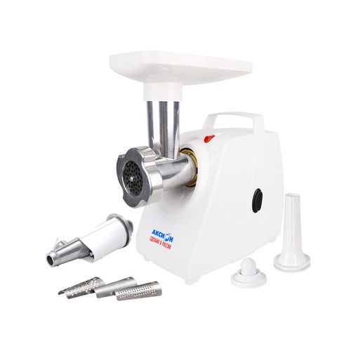 мощность 1500Вт, производительность 1.6кг/мин; количество скоростей 1; защита от перегрева; насадка для колбас; насадка для кеббе; насадка для соков; материал лотка пластик; цвет белый
