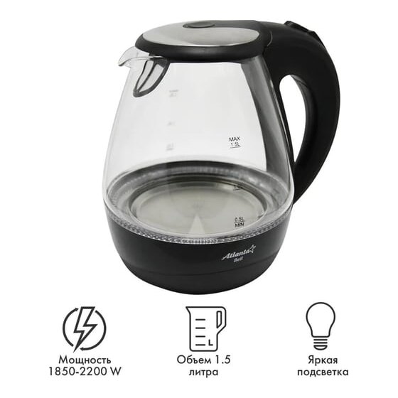 Стеклянный электрический чайник Atlanta ATH-2460 black предназначен для использования в офисе или дома.