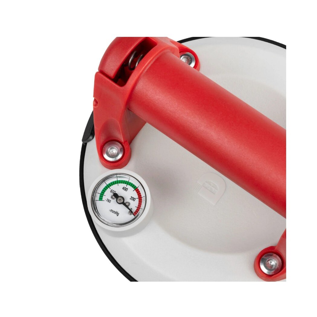 Вакуумная присоска предназначена для ручной переноски и укладки гладкой и мелкорифленой плитки. Присоска может удерживать груз весом до 100кг в течение нескольких часов. Механизм предусматривает наличие поршня создания вакуума с красным контрольным кольцом и манометром давления для дополнительного визуального контроля.